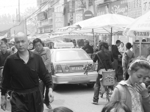 記者在育新街與六一路交叉口看到,路口的許多商販都把商品直接擺放在行車道上,有人站在街上與小販討價還價,自行車、電動車就橫七豎八地停在馬路上。站在路口往南看,高懸的禁行標志下,剛好停了一輛綠色的出租車,本來就不寬的馬路被占去一半。