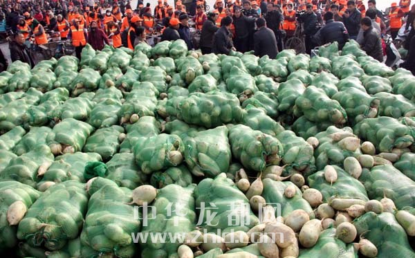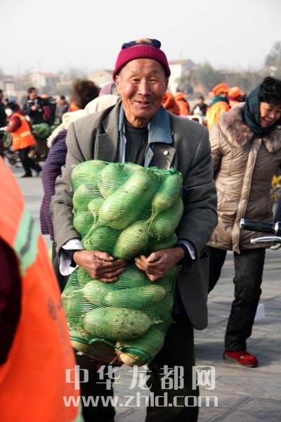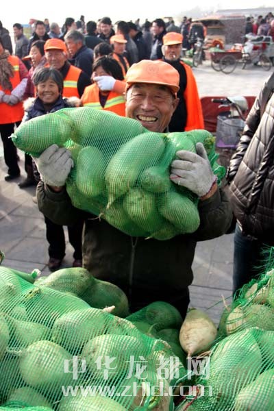 當(dāng)天上午,淮陽縣太昊陵廣場人頭攢動,1000余名貧困家庭代表早早地來到現(xiàn)場等候。9時許,“愛心蘿卜”開始免費發(fā)放。僅一上午時間,20萬斤蘿卜就被認(rèn)領(lǐng)一空。