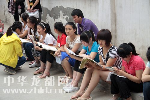 考生等待進(jìn)場(chǎng)前許多學(xué)生突襲溫習(xí)。(戚永/攝)