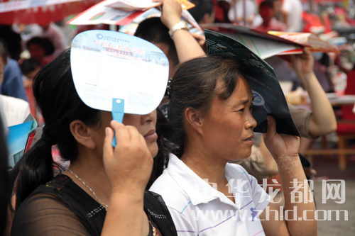 一考生家長(zhǎng)拿著宣傳單遮陽(yáng)。(戚永/攝)