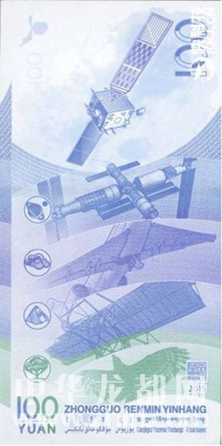 中國航天紀念鈔面額為100元,票面長155毫米,票面寬77毫米,中國航天紀念鈔主色調(diào)為藍色。正面主景圖案為神舟九號飛船與天宮一號交會對接圖案。左上方為國徽圖案、“中國人民銀行”行名,其下方為東方紅一號衛(wèi)星圖案。票面左下方為面額數(shù)字“100”和漢字“壹佰圓”。主景圖案右側(cè)為嫦娥一號衛(wèi)星圖案,其上方為面額數(shù)字“100”和“中國航天紀念”字樣。背面主景圖案由上至下依次為嫦娥一號衛(wèi)星圖案、2020年中國空間站“天宮”、噴氣式客機、馮如2號雙翼螺旋槳飛機、飛禽海東青圖案。票面左上角為風箏局部圖案,右上角為面額數(shù)字“100”。票面下方為行長章與年號“2015”,中國人民銀行漢語拼音字母和蒙、藏、維、壯四種民族文字的“中國人民銀行”字樣與面額,面額數(shù)字“100”,漢語拼音字母“YUAN”。