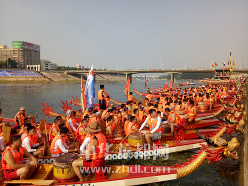 ????當(dāng)日9時(shí)許,位于周口市區(qū)中州大道橋旁的中華龍舟大賽基地鑼鼓喧天,人潮涌動(dòng),不少市民攜家?guī)Э谇皝?lái)觀戰(zhàn)。河中,20多條龍舟整齊地排列在水面上(如圖),等待“點(diǎn)睛”時(shí)刻的到來(lái)。一點(diǎn)龍眼,風(fēng)調(diào)雨順、國(guó)泰民安……點(diǎn)睛人分別為龍舟“點(diǎn)睛”后,第三屆中華龍舟大賽正式拉開(kāi)帷幕。