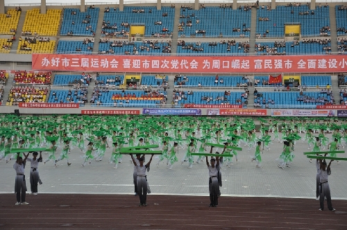 ????大型體育展示表演開始了,《印象周口》氣勢磅礴,來自周口幼兒師范學(xué)校和周口科技職業(yè)學(xué)院、沈丘縣教體局等單位的演員們披著鮮明的旗幟,激情奔跑在寬闊的體育場上,迎風(fēng)飄揚(yáng)的旗幟讓整個(gè)會(huì)場變成了藍(lán)色海洋;周口職業(yè)技術(shù)學(xué)院衛(wèi)生學(xué)院與周口文昌中學(xué)的朗誦表演《荷韻悠長》吟誦豪邁,響徹會(huì)場;周口市自行車協(xié)會(huì)聯(lián)合川匯區(qū)、淮陽縣、太康縣等多個(gè)教體育一起表演的《崛起之路》更是體現(xiàn)了周口正在實(shí)現(xiàn)中國夢的征途上迅速崛起,書寫著新的精彩篇章……