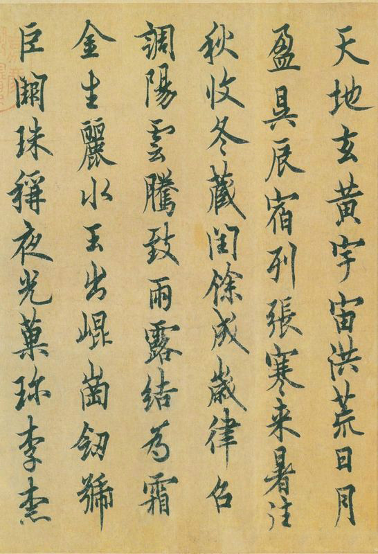 ????《千字文》全書共250句。每四字一句,四句一組,兩組一韻,前后貫通,互不重復(fù)。其內(nèi)容涉及天文、地理、歷史、農(nóng)工、園藝、飲食起居、修身養(yǎng)性及封建綱常禮教等各個(gè)方面。包羅萬象,涵蓋面廣泛,其最大優(yōu)點(diǎn)又在于融知識(shí)性、可讀性和教化性為一爐,誦讀一遍即感到文采斐然,合轍押韻,瑯瑯上口,易誦易記,梁武帝讀后,龍顏大悅,興奮不已。立即命令刻印,作為“諸王”的習(xí)誦課本,并刊諸于世,為初學(xué)者入門教本。從此,不僅中國(guó)帝王之家有了一本集識(shí)字、書法和思想內(nèi)容為一體的啟蒙讀物,而且中國(guó)社會(huì)乃至世界教育史上也有了問世最早、流傳最久、影響最大的蒙學(xué)教材。