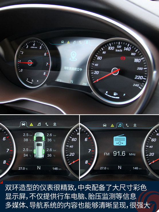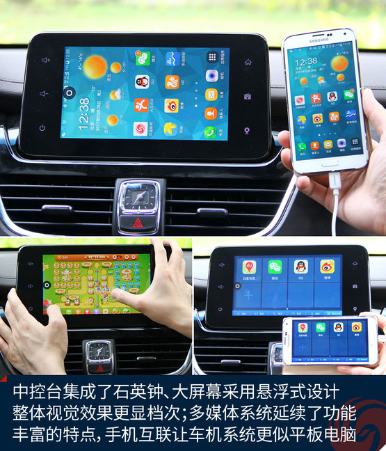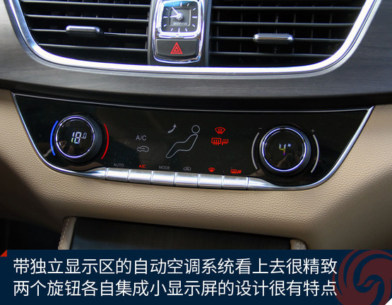 中控臺中央的大尺寸液晶屏顯示效果挺贊,高清屏、亮度高、色彩艷麗,功能上也足夠強大,收音機、藍牙免提、影音播放、GPS導(dǎo)航等等非常全面,前后雷達、360全景影像也能夠在這里清晰顯示,只可惜手機互聯(lián)僅支持安卓系統(tǒng),希望日后能有所完善。下方的自動空調(diào)控制區(qū)很精致,也很顯檔次。