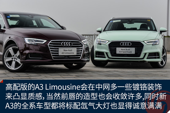 新顏色的加入讓原本青春靚麗的A3變得更加鮮嫩,雖說這樣的顏色不一定適合所有人,但是至少我是很喜歡的,應(yīng)該不少女生也會(huì)心生好感。而外觀的改進(jìn)進(jìn)一步增加了A3的活力,棱角更加鮮明的大嘴,首次出現(xiàn)在A3上的LED矩陣大燈,以及外擴(kuò)的前唇都讓這臺(tái)擁有S-Line套件的A3 Sportback攻擊性十足,同時(shí)全系都將標(biāo)配氙氣大燈也是誠(chéng)意滿滿。而高配置的A3 Limousine會(huì)在中網(wǎng)多一些鍍鉻裝飾來凸顯質(zhì)感,當(dāng)然前唇的造型也會(huì)收斂許多。