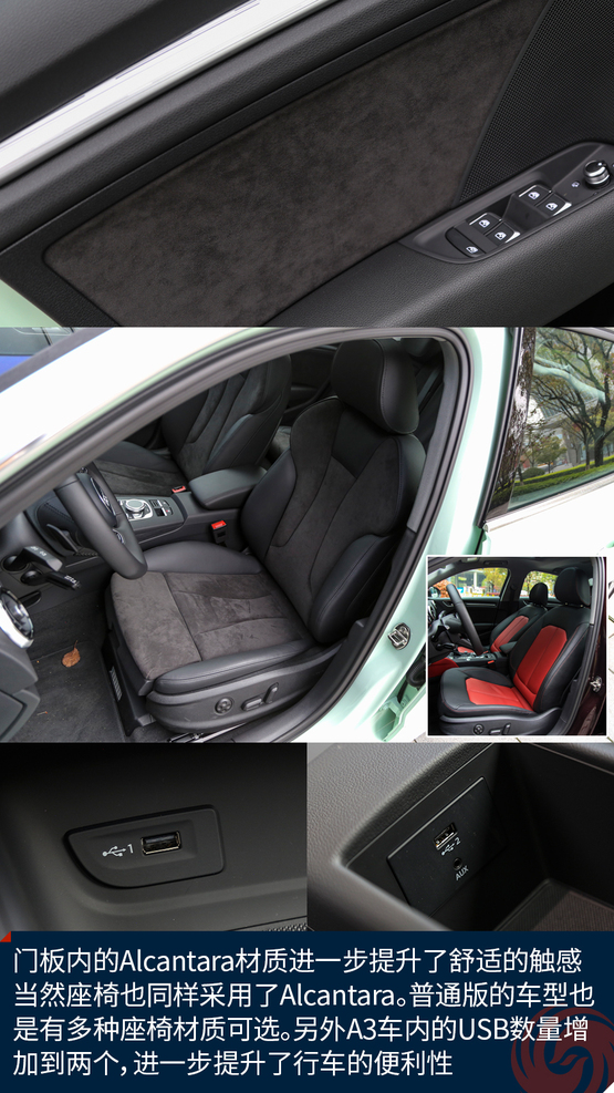 相比較外觀的改變,內(nèi)飾的變化就要少了一些,最直觀的變化莫過于全新設(shè)計(jì)的真皮方向盤,不僅好看也十分的好用,發(fā)光的迎賓踏板進(jìn)一步增加了車輛的高級(jí)感,中控面板上的鋁合金材質(zhì)的裝飾條質(zhì)感出色,不僅如此,還有多種樣式和材質(zhì)可選;而門板內(nèi)的Alcantara材質(zhì)進(jìn)一步提升了舒適的觸感,當(dāng)然座椅也同樣采用了Alcantara。另外新增加的USB接口也進(jìn)一步增加了行車的便利性,這也讓A3車內(nèi)的USB數(shù)量增加到兩個(gè)。同時(shí),全新設(shè)計(jì)的MMI系統(tǒng)操作起來也更加便利,邏輯也更加清晰,并且與7英寸液晶顯示屏均成為標(biāo)準(zhǔn)配置,微微朝向駕駛員的設(shè)計(jì)也更加合理,同時(shí)還支持CarPlay。