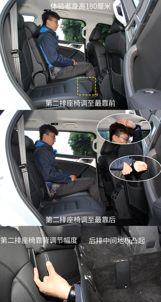 關(guān)于第二排,最重要的當(dāng)然要數(shù)空間了。剛一坐到第二排之后,感覺(jué)確實(shí)是很寬敞,不僅腿部空間毫無(wú)壓力,頭部空間也完全沒(méi)有壓抑感,而且,第二排座椅還支持四向調(diào)節(jié),即座椅前后調(diào)節(jié)和靠背角度調(diào)節(jié),在第三排沒(méi)人乘坐的情況下,第二排乘客基本可以找到N種舒服姿勢(shì)來(lái)應(yīng)對(duì)長(zhǎng)途乘坐。只不過(guò),第二排的中間地板凸起較高,一定程度上影響了中間乘客乘坐的舒適度。