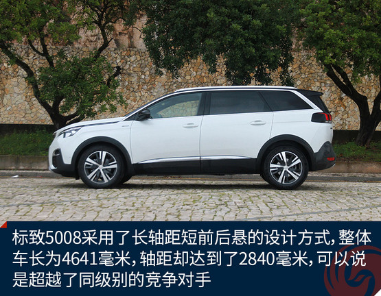 和市面上的一些7座SUV不同,標(biāo)致5008采用了長軸距短前后懸的設(shè)計(jì)方式,這樣的設(shè)計(jì)更多的出現(xiàn)在運(yùn)動(dòng)派車型上。標(biāo)致5008的整體車長為4641毫米,軸距卻達(dá)到了2840毫米,可以說是超越了同級(jí)別的競爭對(duì)手。