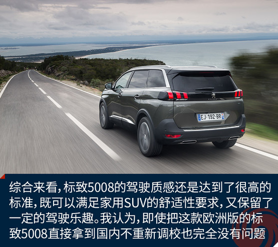 綜合來看,標(biāo)致5008的駕駛質(zhì)感還是達(dá)到了很高的標(biāo)準(zhǔn),既可以滿足家用SUV的舒適性要求,又保留了一定的駕駛樂趣。我認(rèn)為,即使把這款歐洲版的標(biāo)致5008直接拿到國內(nèi)不重新調(diào)校也完全沒有問題。