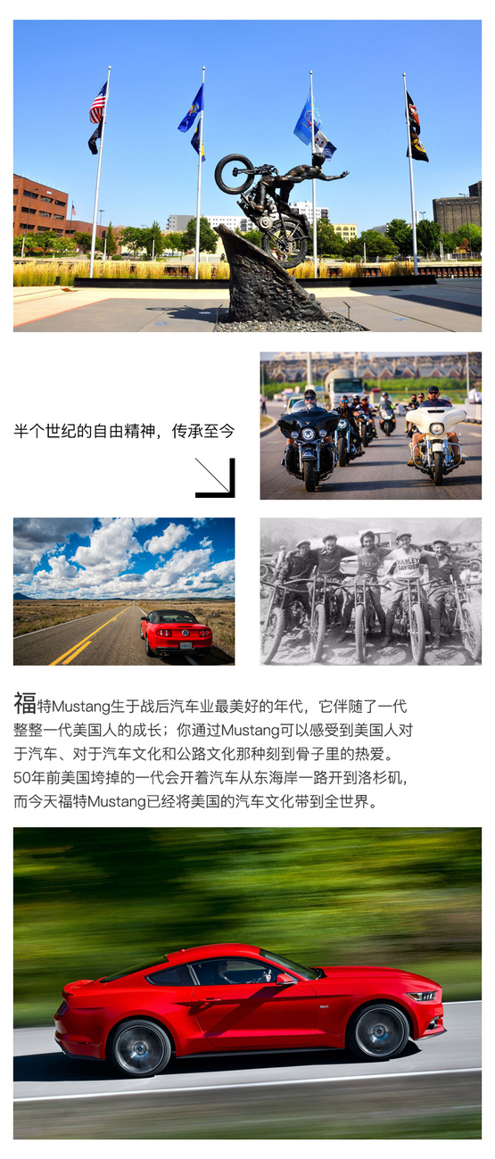 只要你來過美國,就會驚異于美國人對哈雷·戴維森,以及福特Mustang的熱愛,這種熱愛不分年齡不分性別,你會在荒蠻的西部公路上遇到招搖過市的哈雷車隊,也有可能在一家不知名的咖啡廳里邂逅一位開著Mustang的小鎮(zhèn)姑娘。