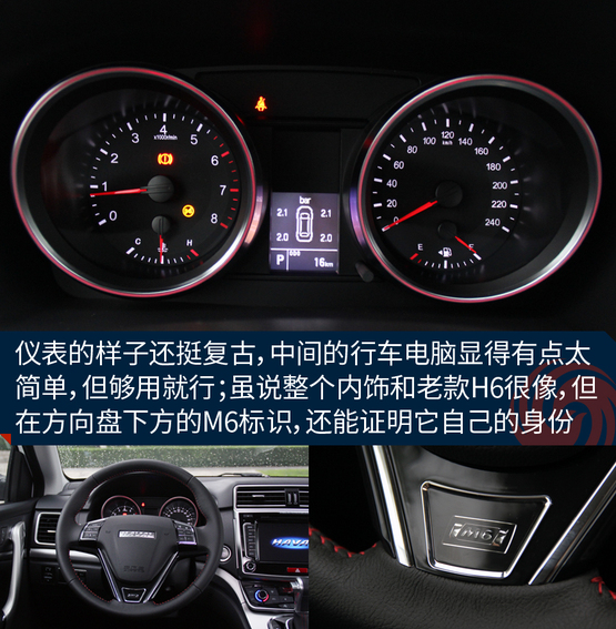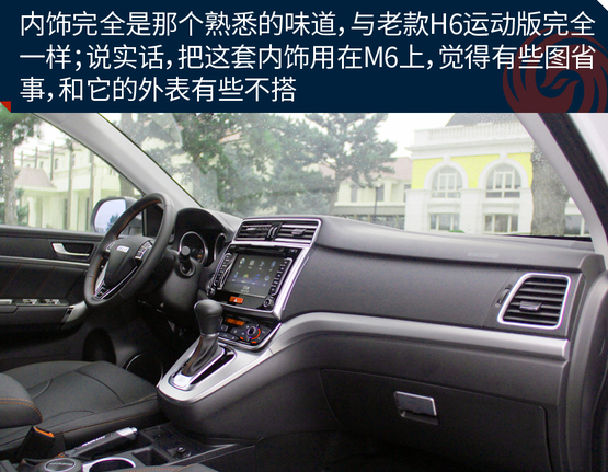????????車上的機械液壓助力轉(zhuǎn)向的力度有點沉,這點和老款H6特別的相似,長時間在低速行駛或者移庫挪車的時候挺廢胳膊,大老爺們長時間開都覺得酸,更何況瘦小的小女孩呢!所以從這點看出,M6會從配置以及更低的價格來吸引消費者,至于想這些其他的問題,大伙就別太吹毛求疵了,畢竟魚和熊掌不可兼得。