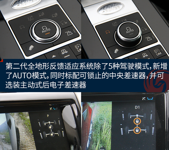 這套第二代全地形反饋適應(yīng)系統(tǒng),提供五種駕駛模式:普通駕駛模式、雪地模式、泥地模式、沙地模式以及攀巖模式。這些放在全新一代發(fā)現(xiàn)上似乎不值一提,不過(guò)第二代系統(tǒng)加入了AUTO模式,可自動(dòng)監(jiān)測(cè)行車(chē)狀況。同時(shí),第二代系統(tǒng)標(biāo)配可鎖止的中央差速器,并可選裝主動(dòng)式后電子差速器。