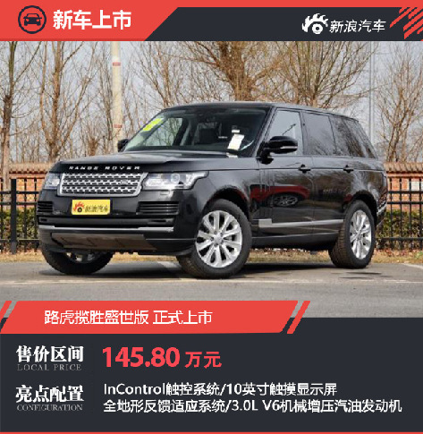 ????新浪汽車訊 今日,路虎宣布攬勝盛世版正式上市,指導售價為145.80萬元。新車即日起接受預定,并將于2017年11月6日正式到店銷售。從指導售價來看,攬勝盛世版將成為攬勝車系的入門車型。