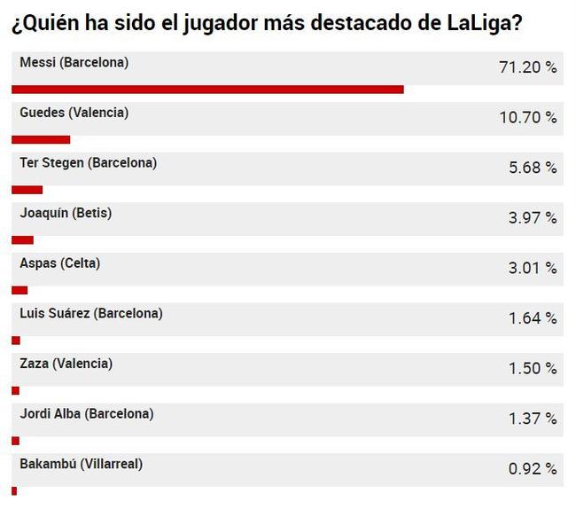 對于西甲半程最佳球員的投票,有高達71.2%的球迷將票投給了梅