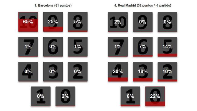 在《馬卡報》做的一系列民意調查中,球迷們?yōu)楦髦蜿牶颓騿T進行了打分和投票。結果顯示有65%的球迷認為巴薩的半程表現(xiàn)可以打滿分10分。而有22%的球迷為皇馬打的是1分的最低分。