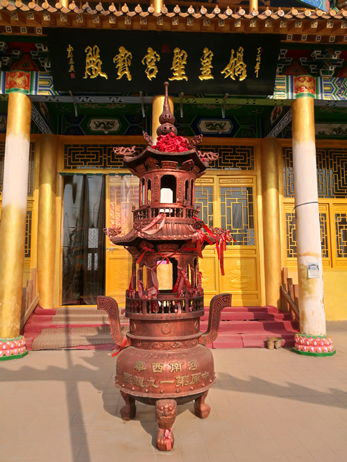 站在昆山女媧宮前向南看,一座高大宏偉的建筑物映入記者眼簾,由于它坐北朝南,我們只能看到它的背影。趙俊明告訴我們,那棟建筑物也是一座敬奉女媧娘娘的大殿,叫做媧皇圣宮寶殿。它是由一位女香客自發(fā)捐資修建的,這座氣派的大殿從無到有、從小到大整整用了14年時(shí)間,花費(fèi)近千萬元。