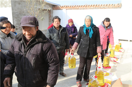 當日上午,雖然天氣寒冷,可葉莊行政村村室院里卻暖意融融。該村村主任熊茂禮正在把備好的年貨發(fā)放到49戶村民的手中?!胺浅8兄x茂禮這么遠回老家看望我們這些困難戶,讓我們過上一個好年?!爆F(xiàn)年76歲的村民張多朗是個五保戶,接過熊茂禮送上的年貨連聲道謝。熊茂禮鼓勵困難戶一定要對生活充滿信心,樂觀地面對生活。同時,希望困難戶要保持良好心態(tài),積極面對困難,自強自立,早日擺脫困境。