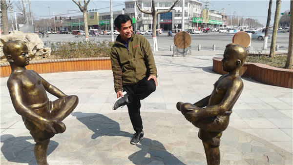 在表現(xiàn)兒童游戲“斗雞”的雕塑前,兩個光背孩童獨(dú)腿站立,分別搬著另一條腿作戰(zhàn)斗準(zhǔn)備。那生動的畫面,令40多歲的市民尚巖青忍俊不禁,他也獨(dú)腿站在雕塑中間,像個開心的孩子一樣,搬著腿和雕塑中的頑童組成一起斗雞的場景。