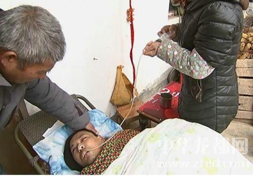 為給兒子治病,3年來,家人花光了所有積蓄,借遍了所有親朋好友。由于無錢治療,張德印只好把兒子從醫(yī)院拉回家里照顧。和老伴兩個人護理他,為了給兒子張肖喂水,只有用針管進行鼻飼,拉屎拉尿帶著尿布、下著尿,每天幾次換洗。