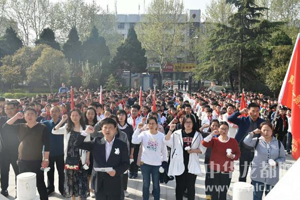 上午八點(diǎn)半,400余名學(xué)生衣著整潔,佩戴紅領(lǐng)巾,手握自備白花,排著整齊的隊(duì)伍從學(xué)校出發(fā),懷著對(duì)烈士無限崇敬的心情來到周口烈士陵園,佇立在傲然聳立的烈士紀(jì)念碑前,莊嚴(yán)肅穆的悼念活動(dòng)開始了。升國旗、唱國歌、敬隊(duì)禮,黨員教師在烈士紀(jì)念碑前重溫入黨誓詞,少先隊(duì)員代表向烈士墓敬獻(xiàn)花圈,全體師生向烈士鞠躬默哀。
