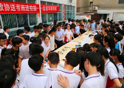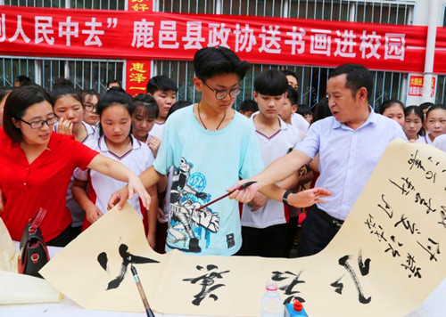 中華龍都網(wǎng)訊(周口報(bào)業(yè)全媒體記者 李瑞才 通訊員 孫廣合 胡洪濤)6月26日上午,鹿邑縣政協(xié)和縣文聯(lián)聯(lián)合開展“到人民中去”送書畫進(jìn)校園活動(dòng),組織10余位知名書畫家走進(jìn)校園,現(xiàn)場(chǎng)揮毫潑墨,為師生義寫字畫。
