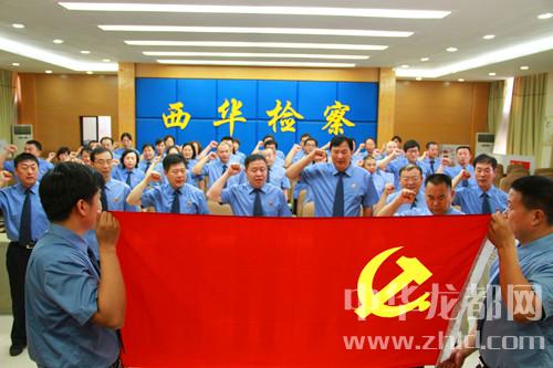 中華龍都網訊(周口報業(yè)全媒體記者 竇娜 通訊員 屈琳琳)“我志愿加入中國共產黨,擁護黨的綱領,遵守黨的章程,履行黨員義務,執(zhí)行黨的決定……”6月28日,面對鮮紅的黨旗,西華縣人民檢察院副檢察長、黨支部書記劉新建帶領全體黨員高舉右手,重溫入黨誓詞。