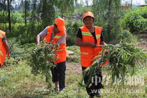“蒿草長(zhǎng)得比人都高,拔都拔不掉,鐮刀都割斷了好幾把了,只能徒手拔。”附近村民姜翠英對(duì)記者說,她和同伴們從早上5點(diǎn)多就開始在這兒除草了,雖然又熱又累,但能為城市美化做點(diǎn)貢獻(xiàn)也很高興。