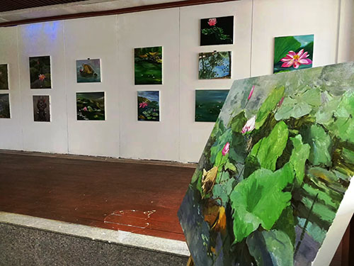 在龍湖荷花盛開的季節(jié),女詩人油畫家三色堇、娜仁琪琪格、愛斐兒、暖玉、白芳芳、劉文文一行6人,來到周口進(jìn)行寫生觀摩,開展老莊文化交流、伏羲太極文化傳播等公益活動(dòng)。7月17日上午開展女詩人油畫家寫生作品展,豐富多樣的活動(dòng)成為淮陽荷花節(jié)一濃墨重彩的一筆。