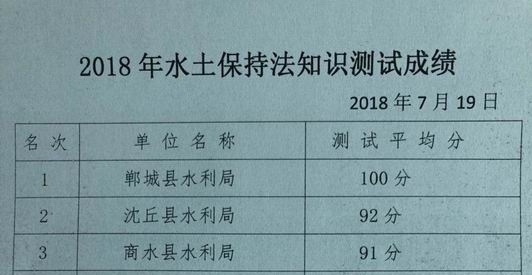 7月20日,一份周口市“2018水土保持法知識(shí)測(cè)試成績(jī)單”傳到鄲城縣水利局,該局以100分的優(yōu)異成績(jī)榮獲全市第一名。