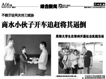 對(duì)于周口晚報(bào)的讀者朋友來(lái)說(shuō),熱心小伙陳亞輝并不算陌生——去年7月,陳亞輝曾駕駛自己的車(chē)輛逼停一位飛車(chē)搶奪項(xiàng)鏈的歹徒(2017年7月26日周口晚報(bào)圖文并茂報(bào)道),商水縣民政局局長(zhǎng)朱赫受縣領(lǐng)導(dǎo)委托,到譚莊鎮(zhèn)慰問(wèn)并看望陳亞輝,后來(lái)陳亞輝被商水縣委、縣政府評(píng)為“見(jiàn)義勇為道德模范”。
