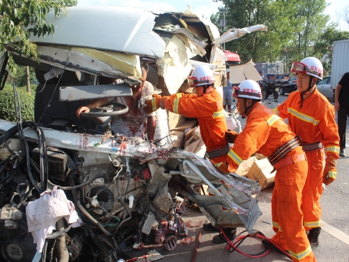 救援人員到達事故現(xiàn)場后看到,一輛依維柯小型貨車與一輛小型罐車發(fā)生激烈碰撞。小型貨車車頭嚴重變形,事故現(xiàn)場一片狼藉,玻璃碎片、鐵皮、散落一地,駕駛室內(nèi)司機被牢牢卡在座椅上不能動彈。