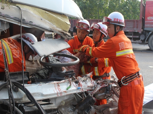 消防官兵一邊對現(xiàn)場進行警戒,一邊實施破拆營救。由于車頭嚴重變形,沒有有利救援支撐的空間,給救援帶來很大的困難。指揮員決定利用機動擴張剪與液壓頂桿對駕駛室進行擴張,待撐出有效救援空間后,迅速對被困人員進行施救。