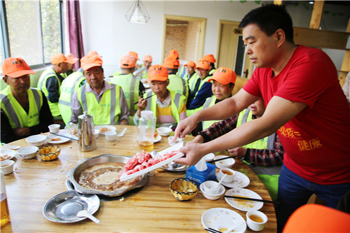 姜玉伸是承擔鳴鹿路北段保潔任務的一名老環(huán)衛(wèi)人,他告訴記者:“從今天夏天開始,該店就在店里設置了環(huán)衛(wèi)工人免費休息飲水點,有時候工作量大的時候,中午回不了家,店老板就讓我們在飯店免費就餐。今天,該店又準備了免費火鍋,讓我們提前過重陽節(jié),我們感覺心里暖暖的?!?/p>