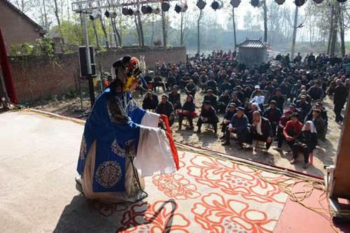 11月3日上午,記者在平店鄉(xiāng)吳吉屯村看到,剛剛落成的村室門(mén)前搭建了一個(gè)大舞臺(tái),洛陽(yáng)市的一家豫劇團(tuán)正在表演精彩的古裝戲曲,舞臺(tái)前坐滿(mǎn)了村民(如圖)。
