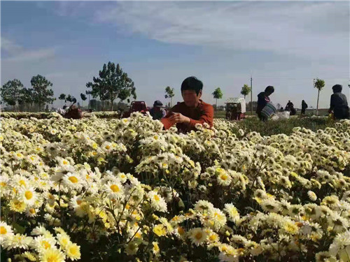 當(dāng)日,位于高集鄉(xiāng)北部的黨橋、雙堂等幾個(gè)行政村,也是熱鬧非凡。一臺(tái)臺(tái)大小不同的車輛,滿載著剛從地里摘下的鮮菊花,正往富甲一方菊花加工廠里銷售,縷縷的菊花清香隨風(fēng)飄來,煞是誘人。在富甲一方合作社帶動(dòng)下,今年有16戶貧困戶種植80多畝菊花,鄉(xiāng)政府對(duì)首次種植的貧困戶負(fù)責(zé)技術(shù)培訓(xùn),并給予每畝1000元的生產(chǎn)獎(jiǎng)補(bǔ)。今年菊花每公斤4元左右,麥茬種植菊花每畝可產(chǎn)鮮菊1100-1300公斤,去掉雇人摘菊花費(fèi)用每公斤0.3元,每畝可收入4000-5000元。種植菊花的貧困戶孫建國(guó)在富甲一方收購現(xiàn)場(chǎng),正樂呵呵的數(shù)著賣菊花得來的大把鈔票。