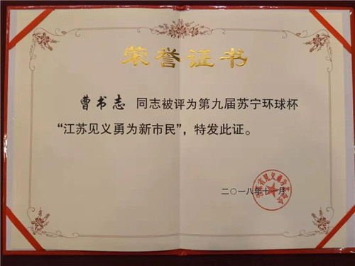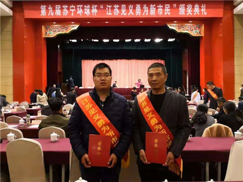 11月14日,江蘇省見義勇為基金會第九屆蘇寧環(huán)球杯“江蘇見義勇為新市民”頒獎典禮在南京舉行,來自河南省項(xiàng)城市新橋鎮(zhèn)的農(nóng)民工曹書志獲此殊榮。
