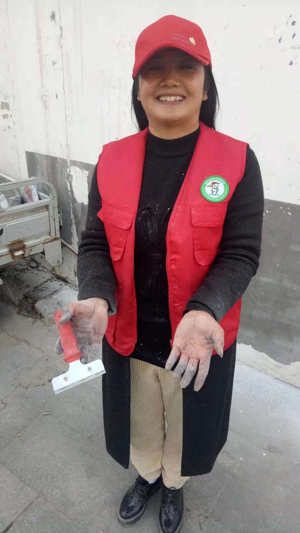 周口市啄木鳥志愿者服務工作委員會臨時黨支部書記、周口市慈孝文化促進會會長孫彩云更是不怕臟,不怕累,連個手套都不帶,直接用雙手拿著鏟刀或者抹布清理墻上的小廣告,最后弄得雙手和滿身都是污漬。“為了我們的城市更漂亮,作為一名志愿者,就應該不怕累,不怕苦?!?/p>