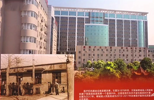 河南電視臺(tái)記者陳貞君在展覽板前介紹,這里是位于第四展區(qū)的兩幅同一所醫(yī)院的照片——河南省鄲城縣人民醫(yī)院,這張是1979年冬天,鄲城縣人民醫(yī)院創(chuàng)建了我國(guó)縣級(jí)醫(yī)院第一個(gè)顯微外科,這就是當(dāng)時(shí)的顯微外科的手術(shù)室和病房的外景,這張是2017年的鄲城縣人民醫(yī)院??梢哉f改革開放讓同一所醫(yī)院有了滄海桑田般的變遷。