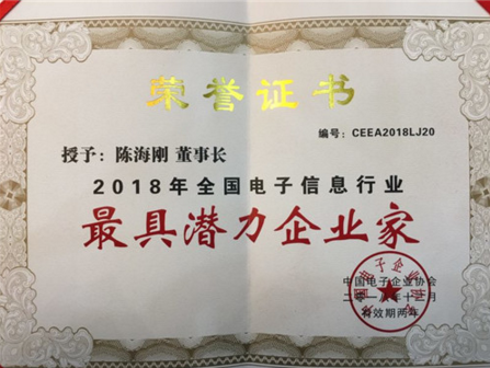 在當(dāng)日下午召開的全國電子信息行業(yè)優(yōu)秀企業(yè)家表彰大會(huì)上,公司董事長陳海剛榮獲“2018年全國電子信息行業(yè)最具潛力企業(yè)家”榮譽(yù)稱號。