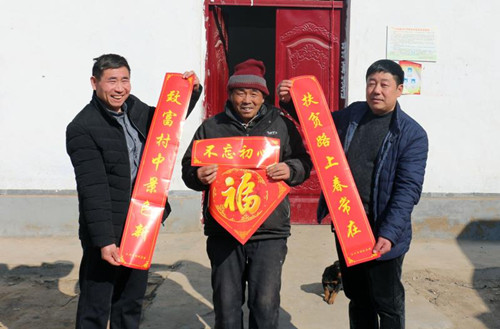 1月24日,扶溝縣白潭鎮(zhèn)王村貧困戶王奎鎖喜滋滋地從縣財政局扶貧工作人員手中接過對聯(lián)。為營造歡樂祥和、文明有序的節(jié)日氛圍,宣傳扶貧政策,扶溝縣財政局對所幫扶7個行政村開展“情暖萬家·迎新春送春聯(lián)”助力脫貧攻堅活動,以此傳達黨的十九大精神和脫貧攻堅精神。