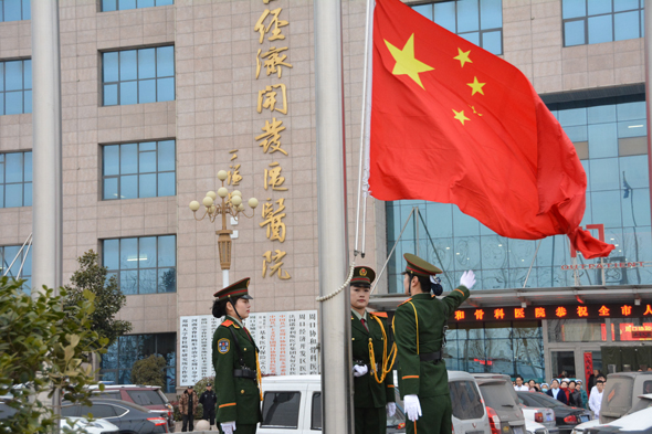 2月10日,正月初六,年后開(kāi)工的好日子。在嚴(yán)格的“禁放令”下,周口城區(qū)沒(méi)有了“開(kāi)門(mén)炮”的喧囂,卻有著更有意義的慶祝方式。圖為周口協(xié)和骨科醫(yī)院隆重舉行升國(guó)旗儀式,全面啟動(dòng)節(jié)后工作,并祝愿祖國(guó)新年好運(yùn)。 記者 李偉 攝