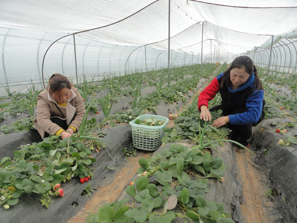 2月27日,商水縣鄧城鎮(zhèn)返鄉(xiāng)創(chuàng)業(yè)標(biāo)兵、鎮(zhèn)人大代表馮杰(右)對草莓進行疏葉管理。馮杰在鎮(zhèn)人大、工商聯(lián)幫助下創(chuàng)辦了生態(tài)葡萄園,并種植了溫室草莓,安排了50名貧困戶就業(yè)。