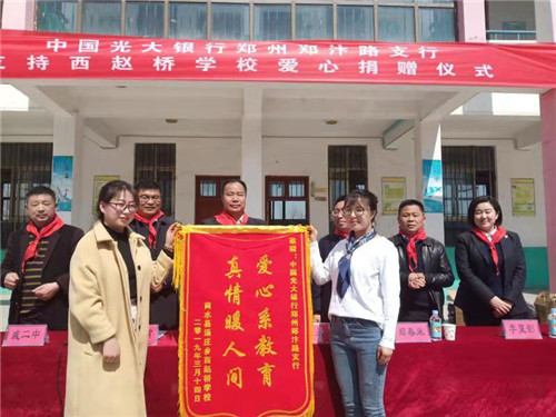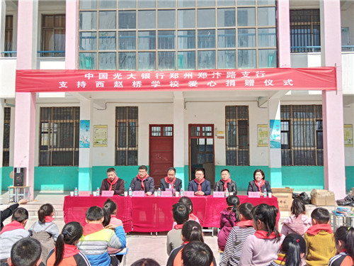 3月14日上午,陽光明媚,春意盎然。中國光大銀行鄭州鄭汴路支行向商水縣湯莊鄉(xiāng)趙橋?qū)W校愛心捐贈(zèng)儀式在趙橋?qū)W校內(nèi)舉行。河南省委組織部駐西趙橋村第一書記楊永,商水縣教體局負(fù)責(zé)人鄭春來、湯莊鄉(xiāng)黨委書記潘建甫等出席捐贈(zèng)儀式。