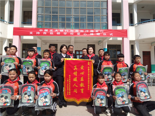 捐贈(zèng)儀式上,鄭汴路支行行長苗長海一行向趙橋?qū)W校捐贈(zèng)文具袋50只、書包50個(gè)、跳繩50根、板球拍50對(duì)、熱水袋50只、圍巾50只、跳棋50盒、沙包200個(gè)。苗長海表示,光大銀行鄭州鄭汴路支行會(huì)一如既往的積極響應(yīng)黨中央脫貧攻堅(jiān)的重大部署,與省、市、縣、鄉(xiāng)結(jié)合繼續(xù)開展形式多樣的愛心扶貧等公益活動(dòng)。他希望趙橋?qū)W校要運(yùn)用好捐贈(zèng)的學(xué)習(xí)、生活、體育用品,同時(shí)勉勵(lì)孩子們一定要好好學(xué)習(xí)、將來回報(bào)社會(huì)各界的關(guān)愛和支持。