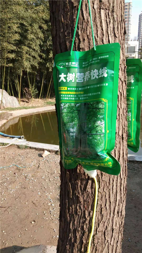 3月18日,記者在市教體局院里看到,幾棵樹上都掛著一個(gè)綠色的塑料袋,塑料袋上寫著“大樹營(yíng)養(yǎng)快線”,袋口向下連著一個(gè)導(dǎo)管,導(dǎo)管與普通的輸液器非常相像,只是在中間的位置分成了兩根,分出來(lái)的兩根導(dǎo)管末端各連著一個(gè)針頭,針頭插進(jìn)大樹接近樹根的位置。據(jù)悉,這些“營(yíng)養(yǎng)快線”可以為樹木補(bǔ)充營(yíng)養(yǎng)和水分,促進(jìn)樹木生根、發(fā)芽,幫助樹木增強(qiáng)抗病能力,提高樹木的成活率,保證樹木整體長(zhǎng)勢(shì)。