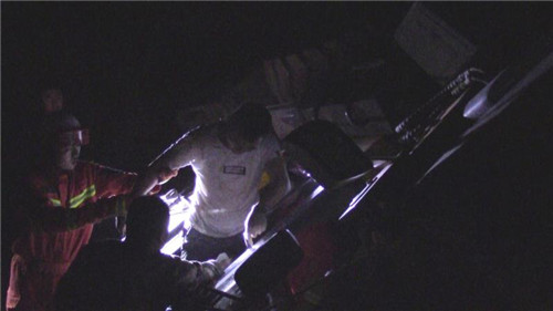 當夜,消防指戰(zhàn)員接到調(diào)派命令后迅速趕往事故現(xiàn)場。指揮員觀察了解得知,側(cè)翻的是一輛重型推土車,由于作業(yè)區(qū)地面不平,司機在倒車時車輛發(fā)生側(cè)翻,欲打開車門跳車未果,左臂反而被車輛駕駛室一側(cè)死死壓在地面上,無法動彈。當時工地上沒有同事,周邊也沒有行人,呼救無應(yīng)后,司機忍著巨烈疼痛摸到手機電話求救。