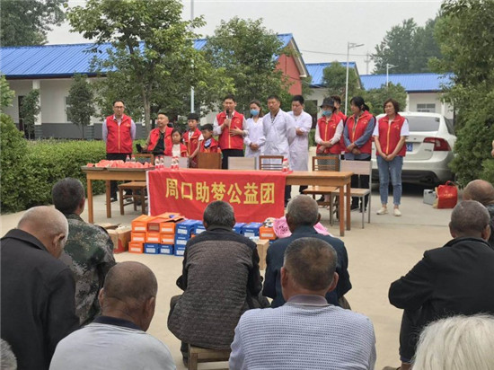 當(dāng)天上午,周口助夢公益團20余名志愿者來到西華縣大王莊鄉(xiāng)中心敬老院,為37名老人帶來了自發(fā)捐款購買的鞋子、毛巾、襪子、香皂、臉盆、香蕉、西瓜等價值近2000元的愛心物資。