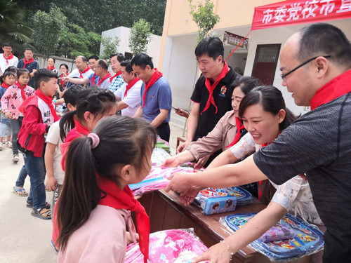 5月29日上午,2019年度市委黨校春季市直科長(zhǎng)班20多名學(xué)員代表,在該校副校長(zhǎng)高鵬帶領(lǐng)下,來(lái)到西華縣大王莊鄉(xiāng)東孫莊小學(xué)開(kāi)展愛(ài)心助學(xué)活動(dòng),為48名小學(xué)生送去圖書(shū)、書(shū)包、文具盒等“六一”禮包。