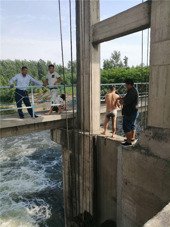 順著喊聲方向,他跑到河閘邊,發(fā)現(xiàn)一男子騎在距水面約半米的閘門上,側(cè)身彎腰拉著一在水中掙扎的女青年。河面很寬,從上流奔騰而下的水匯集到閘門前,由于河道變窄流得很急。女青年的一只手被男子牢牢拉住,身體在深4米多的水中四處晃擺。男子體力消耗很大,有點(diǎn)堅(jiān)持不住,不住地抬頭呼救。